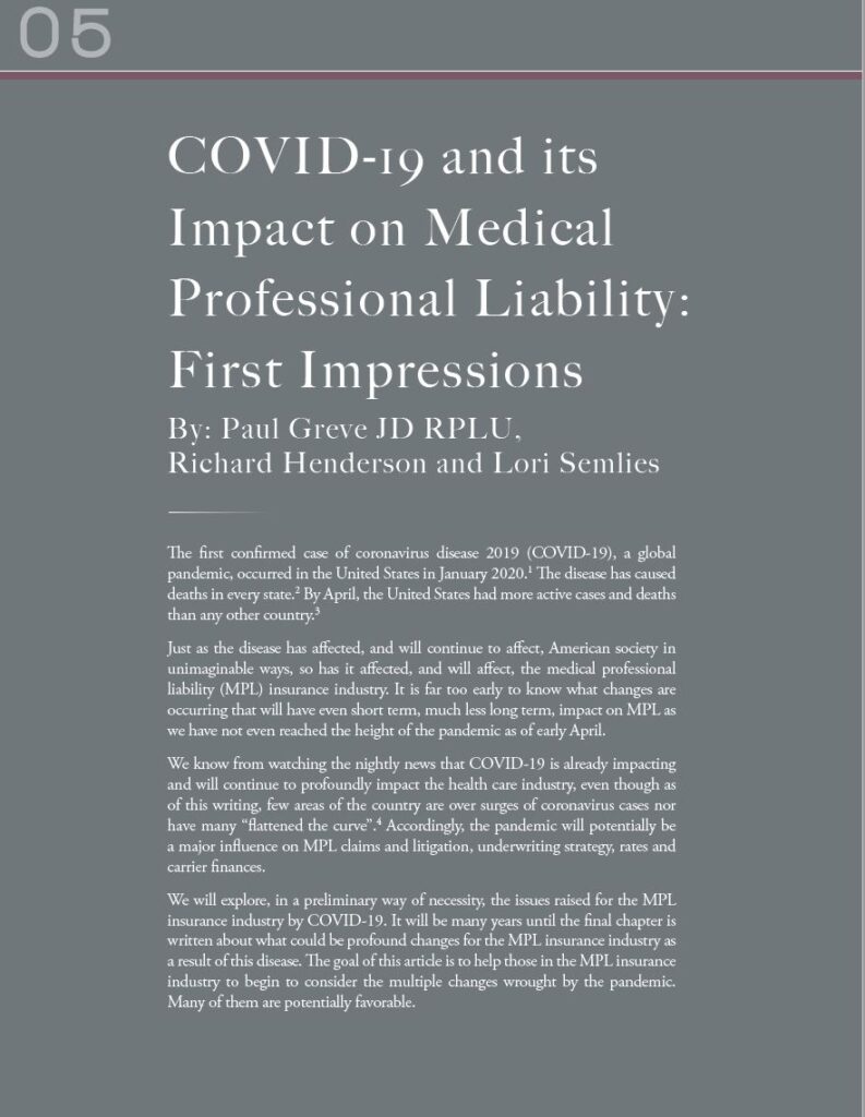 Rich Henderson joins Paul Greve (Markel Specialty) and Lori Semlies (Wilson Elser Moskowitz Edelman & Dicker) to offer some early thoughts on how the pandemic will affect the medical professional liability market.